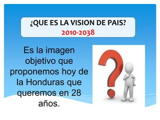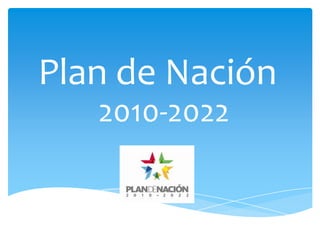 El documento presenta el Plan de Nación de Honduras para el período 2010-2022. El Plan de Nación establece una visión de país para 2038 y acciones específicas para los próximos 12 años para alcanzar esa visión. Los planes de gobierno de cada administración de 4 años deben contribuir al logro de las metas y mejoras del Plan de Nación. El Plan de Nación tiene como objetivos eliminar la pobreza extrema, mejorar la educación y la salud, consolidar los sistemas de previsión social, desarrollar el país de manera dem