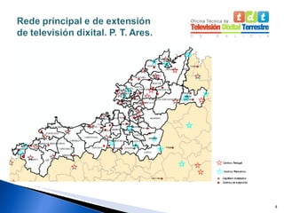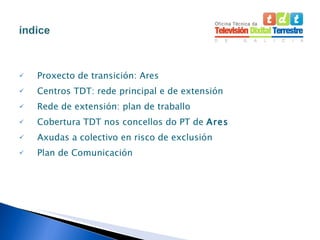 Proxecto de transición:Ares Centros TDT: rede principal e de extensión Rede de extensión: plan de traballo Cobertura TDT nos concellos do PT de Ares Axudas a colectivo en risco de exclusión Plan de Comunicación