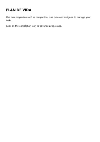 This document discusses managing tasks using task properties like completion, due date, and assignee. It suggests using the completion icon to advance task progress. The document appears to be about managing a plan or tasks using properties and an icon to track completion.
