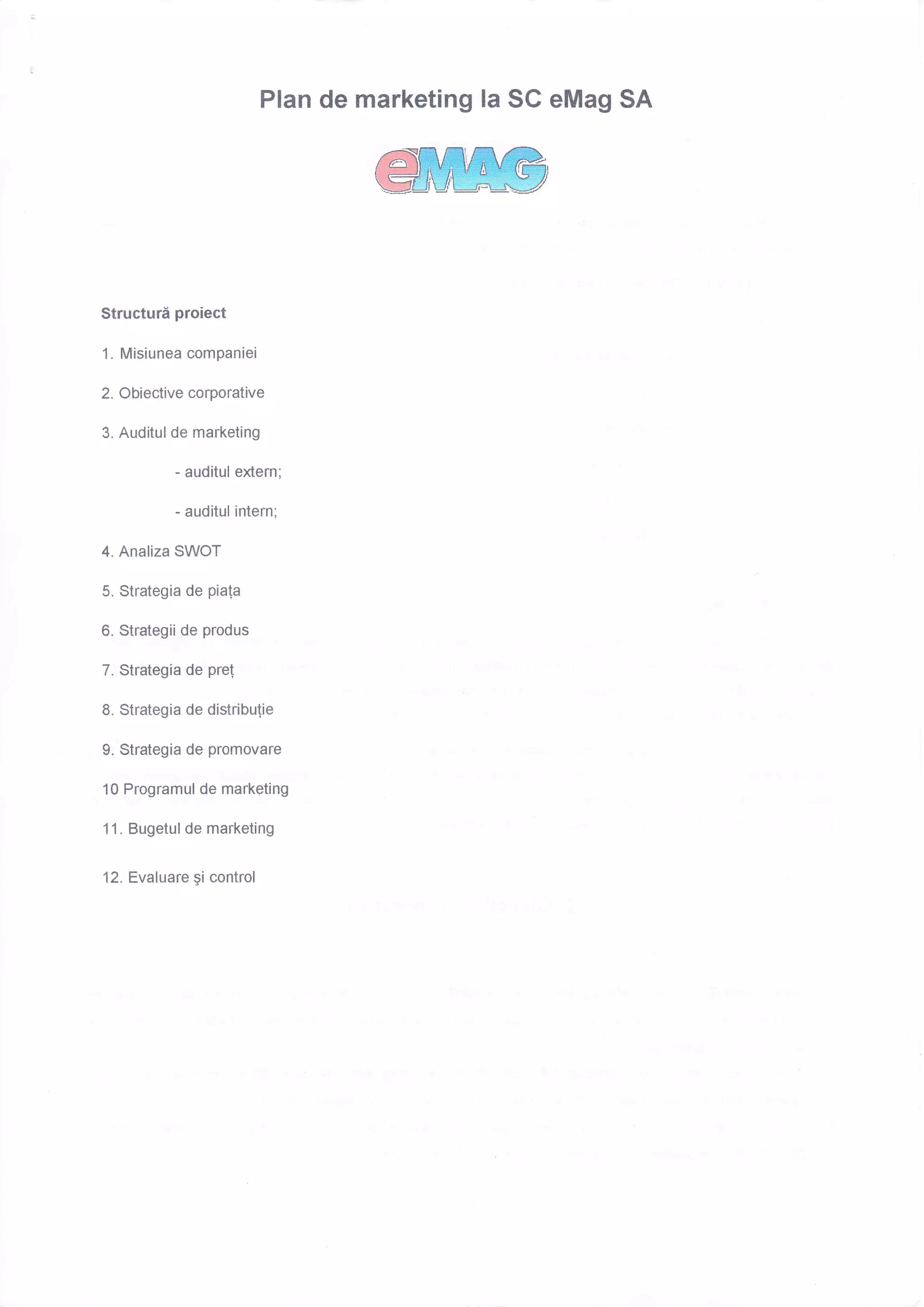 Documentul conturează un plan de marketing pentru eMAG, incluzând misiunea, obiectivele corporative, auditul de marketing și analiza SWOT. eMAG își propune o consolidare a relațiilor cu clienții și menținerea unei cifre de afaceri de 140-150 milioane euro în 2008, având ca strategie dominarea pieței de produse IT. De asemenea, se evidențiază creșterea continuă a comerțului electronic în România, cu o estimare de 300 milioane euro în 2008, și importanța dezvoltării infrastructurii de plată online.