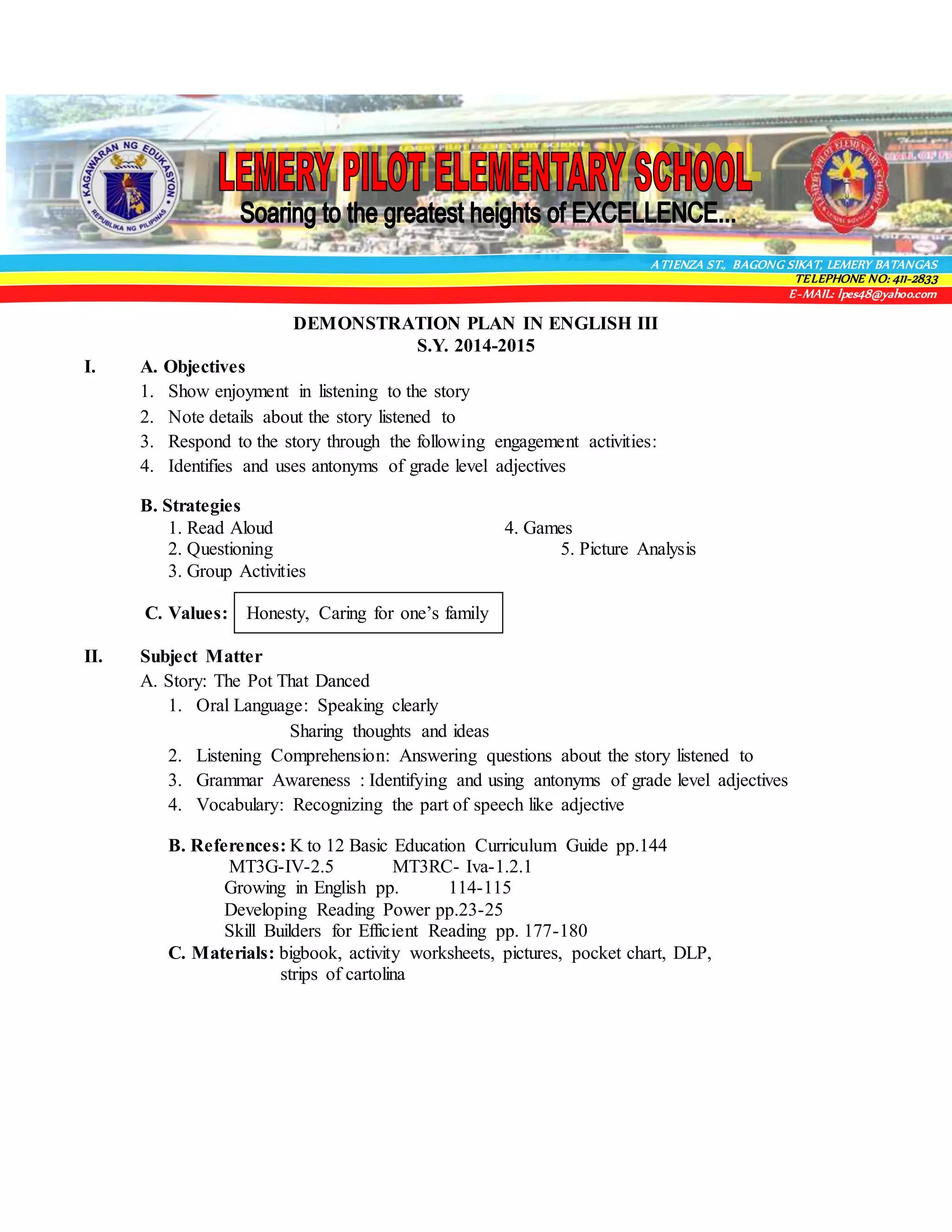 The document outlines a demonstration plan for an English lesson in Grade 3. It involves reading aloud and discussing the story "The Pot That Danced". The objectives are for students to enjoy the story, note details, and respond through engagement activities like identifying antonyms. The lesson plan details the activities over two days, which include reading the story, asking comprehension questions, acting out scenes, and a game to identify antonyms.