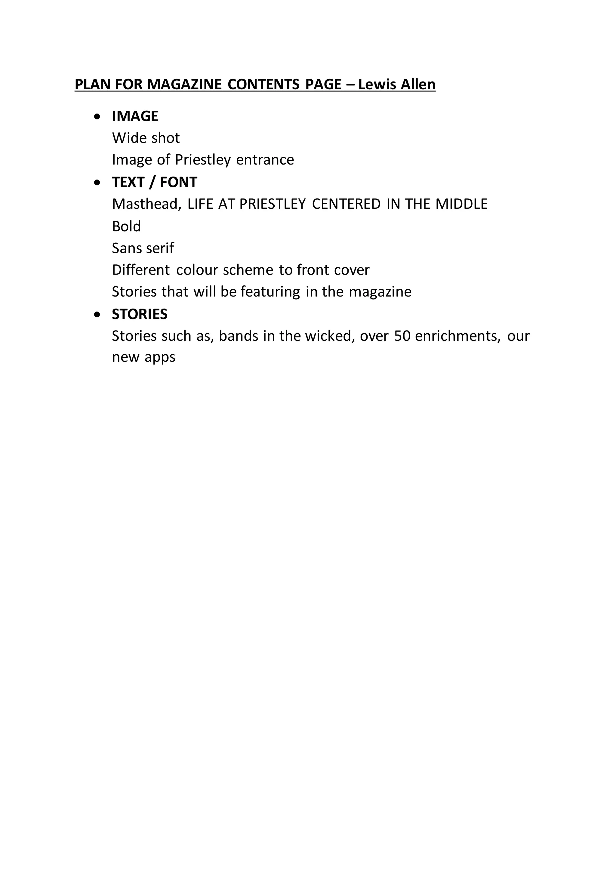 This document outlines a plan for the contents page of a magazine. It specifies using a wide-shot image of the Priestley entrance as the main image. The text should include the masthead "LIFE AT PRIESTLEY" in a bold sans-serif font in a different color scheme than the front cover. It also lists potential story topics to highlight in the magazine, such as bands, enrichments, and new apps.