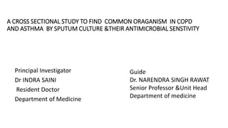 1. This cross-sectional study aims to identify common organisms causing infections in COPD and asthma patients by sputum culture and determine the antimicrobial susceptibility patterns of isolated microorganisms.