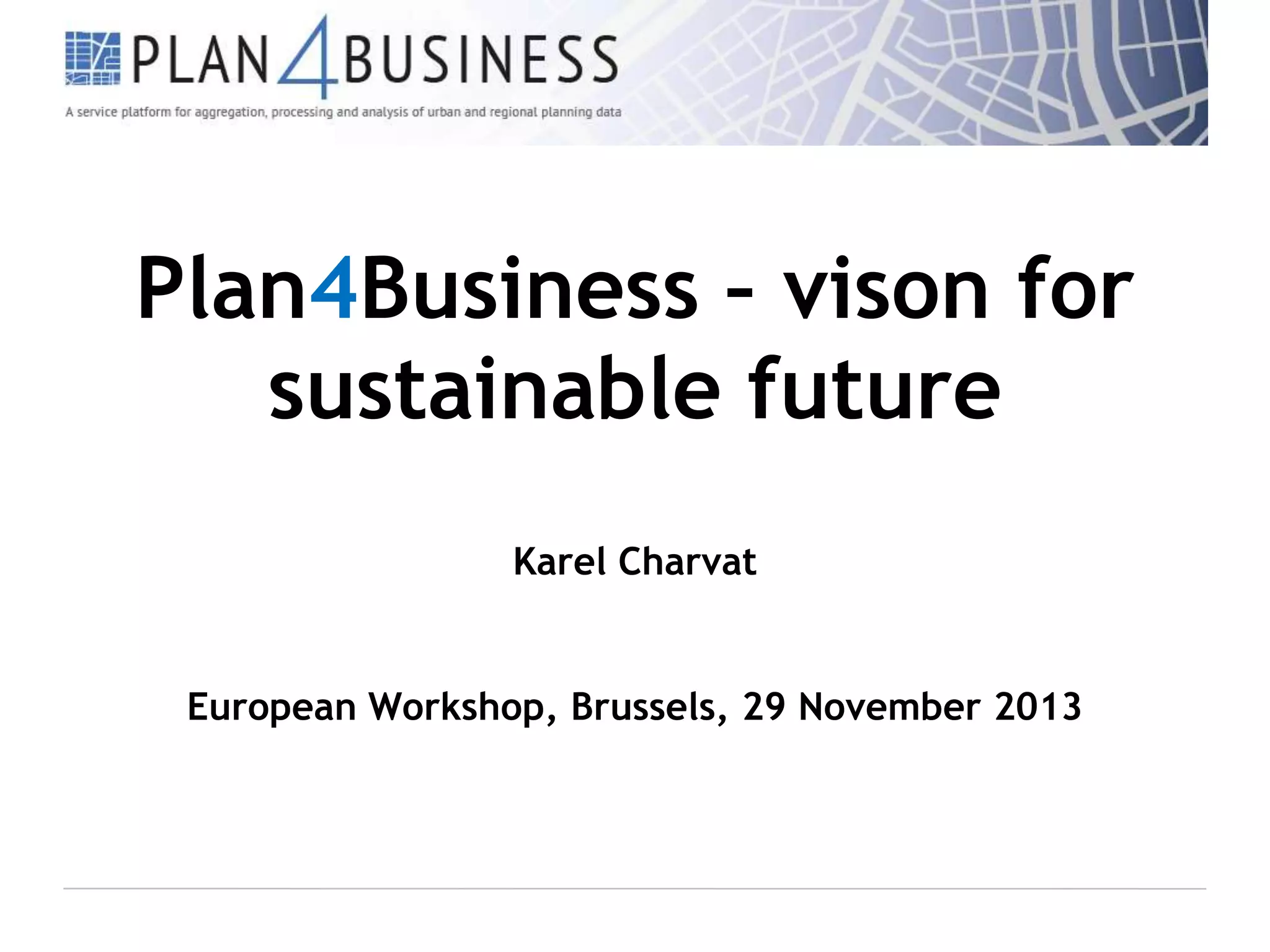 The document outlines a plan called Plan4Business that aims to establish platforms for open and commercial data sharing to enable sustainable business practices. It proposes an "onion model" with an open data platform at the core that is separated from commercial repositories and services. The open platform would make data more accessible for communities and not dependent on any single commercial entity. It describes policies for data ownership, licensing, and interoperability on the open platform. Revenue models are suggested for maintaining both platforms, including contributions, future project funding, advertising, and cost-sharing partnerships. The goal is to eventually expand commercially across Europe and beyond while building a large community around the open data resources.