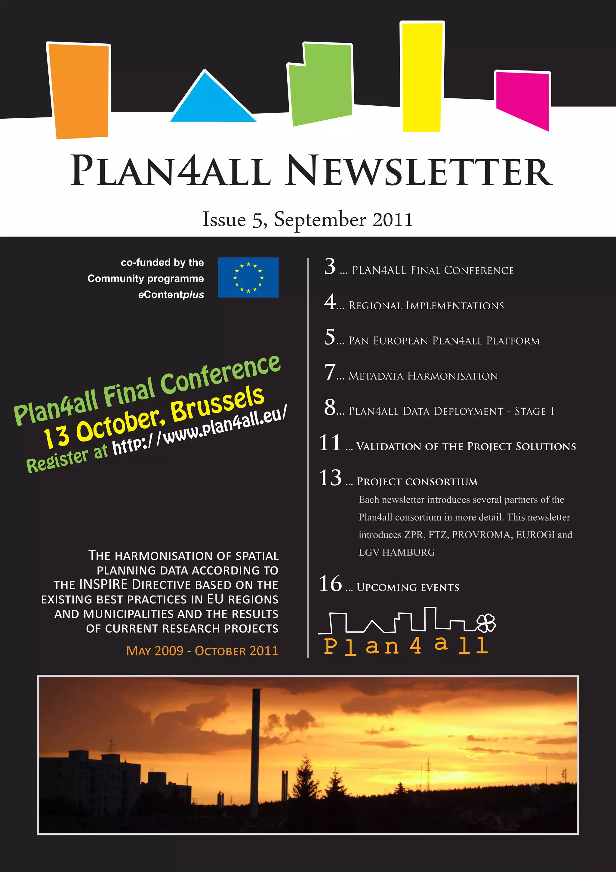 The document discusses the Plan4all project, which aims to harmonize spatial planning data and metadata according to INSPIRE principles. It announces an upcoming final conference in Brussels to discuss solutions for spatial planning in Europe. It also provides updates on regional implementations of Plan4all, the development of a pan-European Plan4all platform, and metadata harmonization efforts.