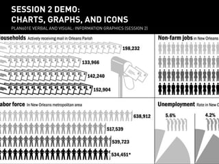 This document provides instructions for creating different types of charts, graphs and icons using Adobe Illustrator. It demonstrates how to make pie charts and bar charts using Excel data, and provides step-by-step guidance for customizing colors, labels and other design elements. The document also outlines three approaches for creating icons - tracing images, converting typographic icons, and using Creative Commons icons. The overall purpose is to teach information graphics and data visualization techniques.