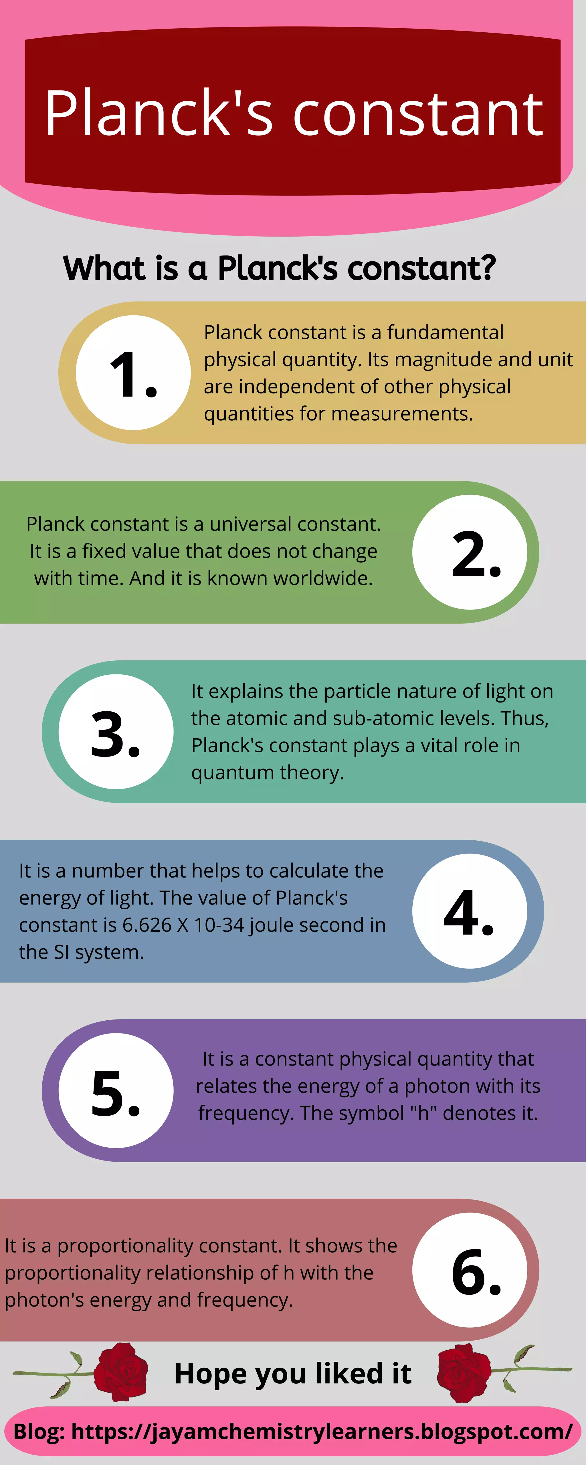 Planck's constant is a fundamental physical quantity that describes the relationship between the energy of a photon and its frequency, with a fixed value of 6.626 x 10^-34 joule seconds. This universal constant is essential in quantum theory and emphasizes the particle nature of light at atomic and sub-atomic levels. It is denoted by the symbol 'h' and serves as a proportionality constant in calculations.