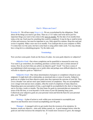 This document outlines exercises to help the reader uncover their life goals and develop a personal planning process. It begins with an introduction explaining the author's own experience lacking life goals and developing a plan using index cards. It then defines key planning terms and describes four exercises: 1) Writing down 5 important goals for the next 6 months, 2) Creating "I am" cards to identify strengths/roles, 3) Mind mapping one's life, and 4) Creating a comprehensive to-do list. The document aims to help the reader gain clarity around who they are and what they want to achieve to develop an effective personal plan.