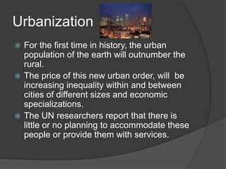 The document discusses the rise of slums in urban areas due to increasing urbanization and inequality. Some of the key causes of slums mentioned include colonialism which denied land ownership rights, racism/apartheid policies that forced people of color into segregated areas, and globalization resulting in many unskilled migrant workers. The living conditions in slums are characterized as lacking basic services with overcrowded and insecure housing often situated in hazardous areas. The growth of slums is projected to continue as more people migrate to cities in search of opportunities.
