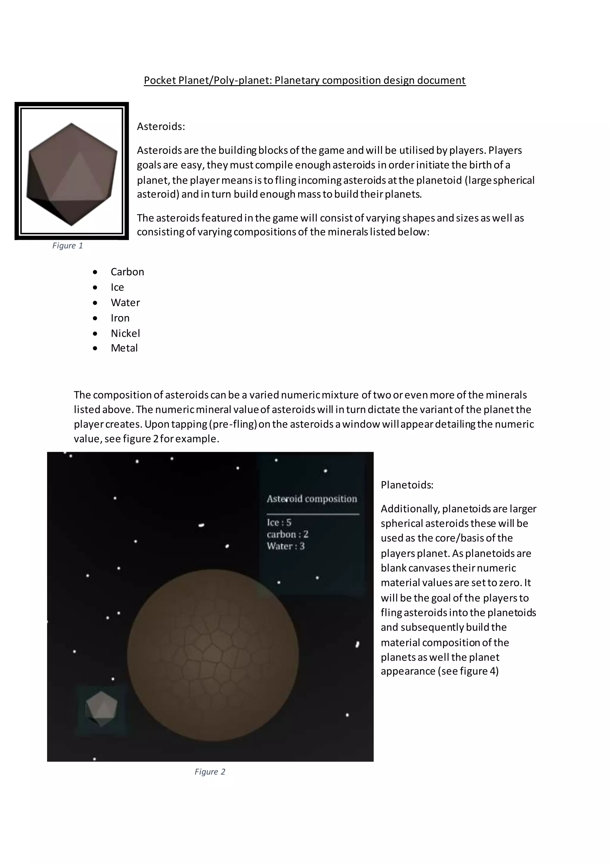 Players must fling asteroids at planetoids to build up their mass and composition in order to create planets. Asteroids come in different shapes, sizes, and mineral compositions of carbon, ice, water, iron, nickel, and metal. The minerals in an asteroid determine what type of planet is created. Planetoids act as the core for planets and have initial zero composition values that increase as asteroids are flung into them. Different mineral combinations result in planet types like rocky, icy, water, or metallic worlds.