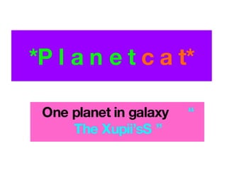 The document describes life on the planet "Planet Cat" which is located in the galaxy called "The Xupii'sS". It details that the planet is shaped like a cat and the inhabitants are alien cats. It provides brief descriptions of the transports, food, hobbies, houses, jobs, and families on Planet Cat.