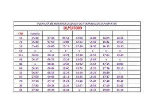 This document contains a schedule of departure times for buses leaving the Terminal de San Martin on October 9, 2009. It lists the bus numbers and their scheduled departure times at 15:10, 07:40, 09:54, 12:00, 14:08, 16:09 and 18:21. There are schedules for 14 bus lines with numbers ranging from 15 to 87.