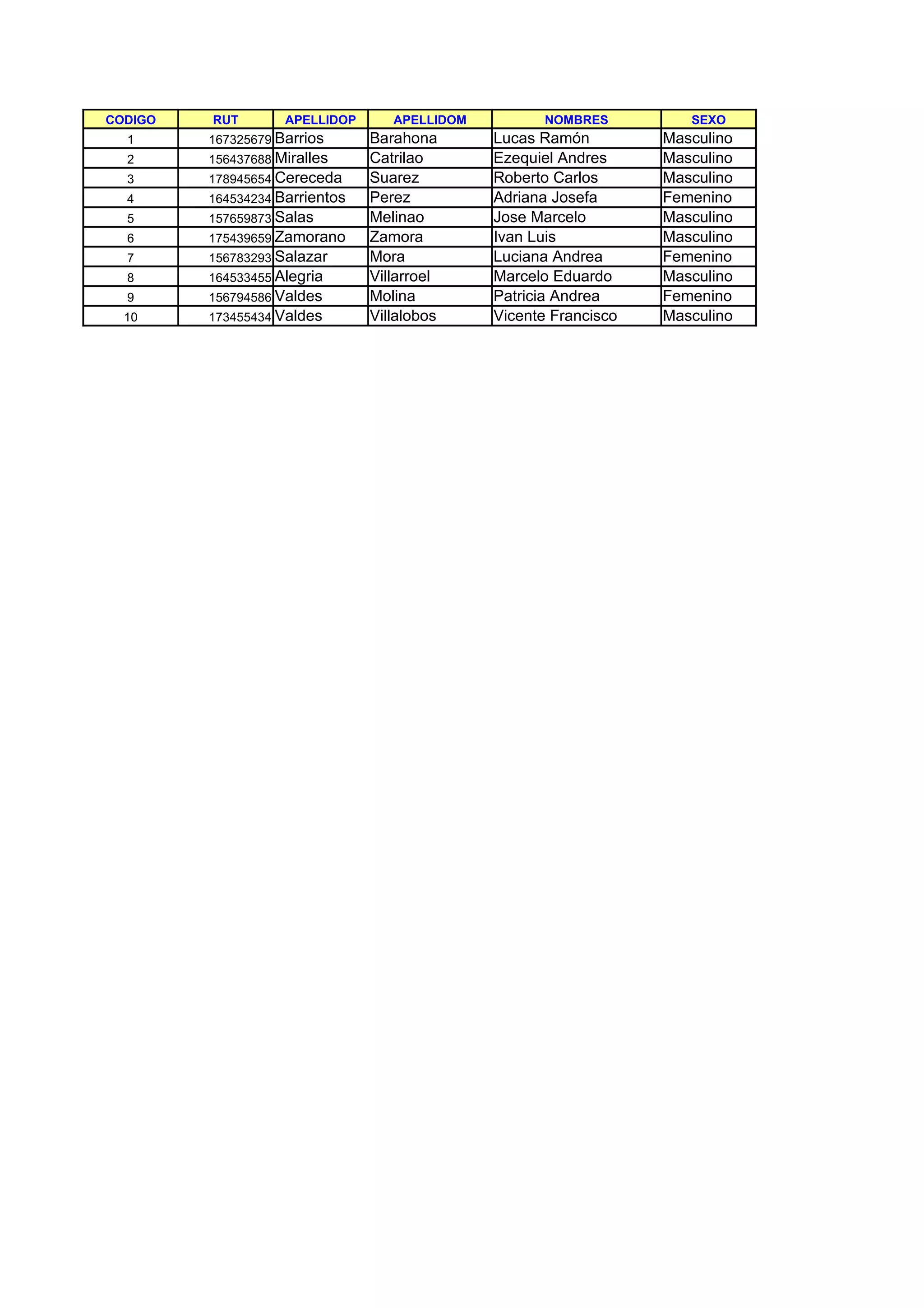 The document contains a table with 10 rows of employee data including name, gender, address, job details, compensation and benefits. It lists code, identification number, last names, first names, gender, nationality, marital status, date of birth, address and more for each employee. The table provides information on position, hiring date, salary and other financial details for each listed staff member.