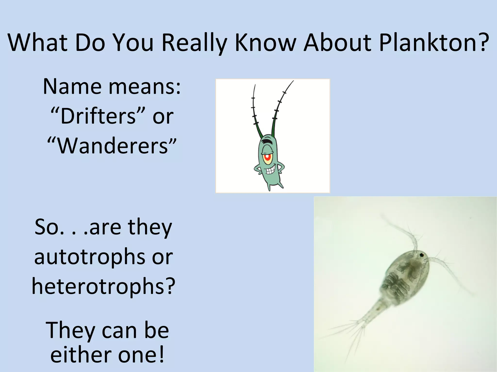 Plankton are tiny organisms that drift or float in the waters of seas, lakes, and rivers. They can be either autotrophs, which produce their own food through photosynthesis (phytoplankton like diatoms and dinoflagellates), or heterotrophs, which consume other organisms for food (zooplankton like tiny crustaceans). Phytoplankton are the base of the oceanic food web and are found in the photic zone where there is enough sunlight for photosynthesis. Some phytoplankton can bloom rapidly and be dangerous. Plankton play an important role in marine ecosystems.