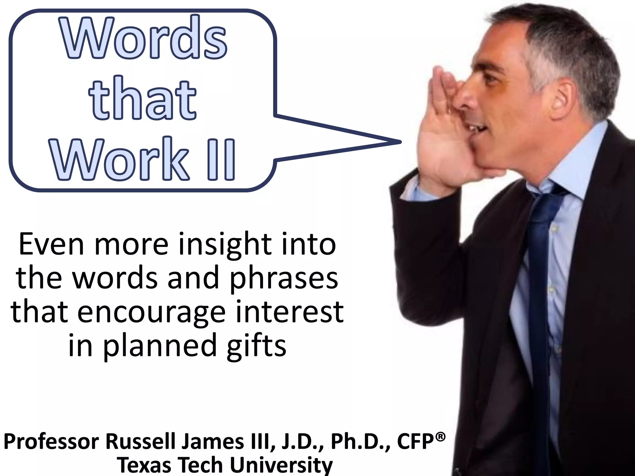 The document discusses effective phrases and strategies for promoting planned giving, particularly charitable gift annuities, emphasizing the importance of relatable language and targeted messaging. It includes survey results on preferences and interests regarding terminology and imagery for potential donors, while exploring generational differences in engagement. Key recommendations focus on using clear, appealing terms and presenting information that aligns with donor expectations and understanding.