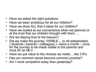 This document outlines suggestions for improving planners to make them more effective tools for planning, reflection, and ensuring accountability. It recommends including non-negotiable routines and processes, learning outcomes, documentation of student work, and space for daily, weekly, and monthly reflections. Sample prototypes are provided for key stages 1 through 3, with recommendations for including things like unit overviews, session plans, milestone tracking, rubrics, and ensuring the planner facilitates connecting activities to broader goals.
