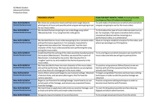 The document outlines the production process for a music video over several months, including choosing an artist and song, establishing the concept, filming in various locations, editing footage, completing ancillary materials like packaging, and gathering feedback before publishing the final video. Potential issues addressed include weather problems during filming and ensuring all necessary footage is obtained.