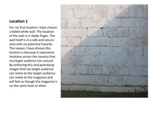 This location is a faded white wall in Stoke Poges, England. The wall represents typical areas where the target audience lives. The location is safe and secure with no hazards. The document's author chose this location to portray images the target audience can relate to and feel the magazine is at their level.