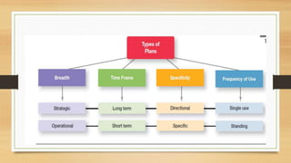 Planning involves defining organizational goals, strategies, and plans. There are formal and informal types of planning. Goals are desired outcomes that guide decisions, while plans outline how goals will be achieved. Stated goals are what an organization publicly claims its goals are, while real goals are what the organization actually pursues based on members' actions. Types of plans include strategic plans for the whole organization, operational plans for specific areas, long and short-term plans based on timeframe, specific plans with no ambiguity versus directional flexible plans, single-use plans for unique situations, and standing ongoing plans.