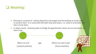 Planning is setting objectives and targets and formulating an action plan to achieve them. It bridges the gap between the present position and the future desired position. Planning involves deciding in advance what is to be done in the future and selecting objectives, policies, and programs. Effective planning has well-defined objectives, is simple, comprehensive, flexible, achieves objectives at minimum cost, and involves participation of all concerned. Management by objectives is a process where managers set goals with their superiors to be achieved in the upcoming period and is evaluated periodically. It aims to clarify job expectations and relate individual performance to organizational goals.
