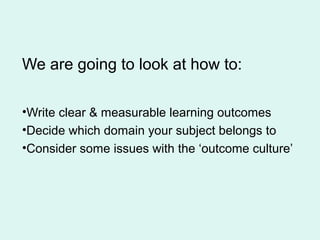 The document discusses how to write clear and measurable learning outcomes based on Bloom's taxonomy of cognitive, psychomotor, and affective domains. It also addresses some issues with an overemphasis on outcomes, such as constraining learning and focusing more on products than processes. Effective use of outcomes involves creating interest, making them into tasks, and facilitating reflection and self-assessment.