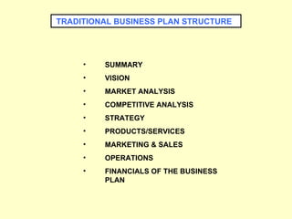 The document discusses strategies for business planning and development. It recommends developing a traditional business plan structure that includes vision, market analysis, competitive analysis, strategy, products/services, marketing and sales, and financials. It also recommends creating a strategic SWOT analysis to identify strengths, weaknesses, opportunities, and threats. Additionally, it suggests developing a sustainable competitive advantage and key success factors to guide business goals and performance measures.