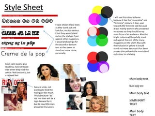 - Plans for photos of a blonde model on the cover and contents page in casual clothes against plain backgrounds. Additional photos of a classmate are planned for the contents page and double page spread to feature the main article.