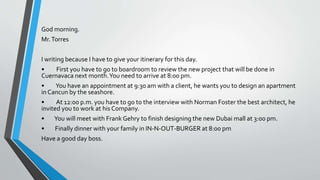 You have a full day scheduled starting with a meeting at 8:00 am to review a new project in Cuernavaca. At 9:30 am you have a client meeting to design an apartment in Cancun, and at 12:00 pm an interview with Norman Foster about a potential new job. Your afternoon includes finishing the design for a new Dubai mall with Frank Gehry at 3:00 pm, and you will have dinner with your family at 8:00 pm at IN-N-OUT-BURGER.