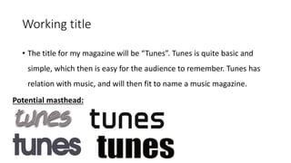 The document outlines plans for a music magazine targeted towards teenagers aged 16-19 who enjoy pop music. Key details include: