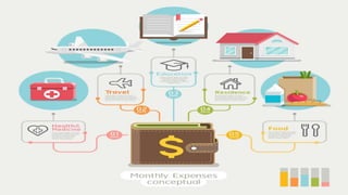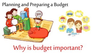Planning and preparing a budget is important for good money management. It involves listing all expenses to balance income and expenditures and ensure needs are met before wants. The steps include determining monthly income, listing expenses, allocating amounts to fixed and flexible expenses, and checking if total expenses match income to avoid overspending. An example budget plan allocates percentages of monthly income to expenses like food, housing, education, and savings. Sticking to a budget requires keeping expenses in separate envelopes, making shopping lists, and only spending allotted amounts.