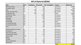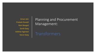 The document provides a detailed procurement plan for transformer components, including a bill of materials and cost analysis. It emphasizes the importance of low-loss transformers for reducing operating costs and environmental impact. Additionally, it outlines the tender process and relevant standards for supplier qualifications and materials.