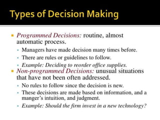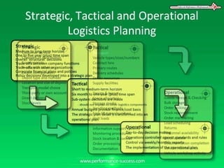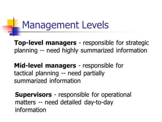 Strategic planning involves long-term goals at the top level of an organization. Tactical planning refers to middle-level procedures that transform strategic plans into specific goals. Operational planning involves routine tasks at the lower levels. Managers at different levels can provide input to strategic plans, which must align with organizational goals. CEOs ensure open communication and awareness across all levels.