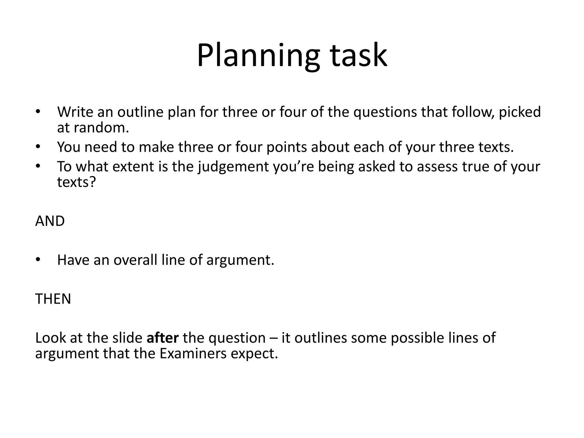 This document provides sample planning questions and possible content outlines for responses to three gothic literature planning questions. It includes outlines for questions about how gothic writing explores forces beyond human understanding, the struggle between good and evil, and whether gothic writing is unintentionally comic. Sample question outlines are also provided for questions on death as punishment for sin, disruption of the natural order, whether gothic writing lacks tension, the dangers of aspiring beyond limitations, the role of obsession, and whether gothic villains make evil seem attractive. The document is intended to help students plan responses by providing examples of the types of points and lines of argument expected by examiners.