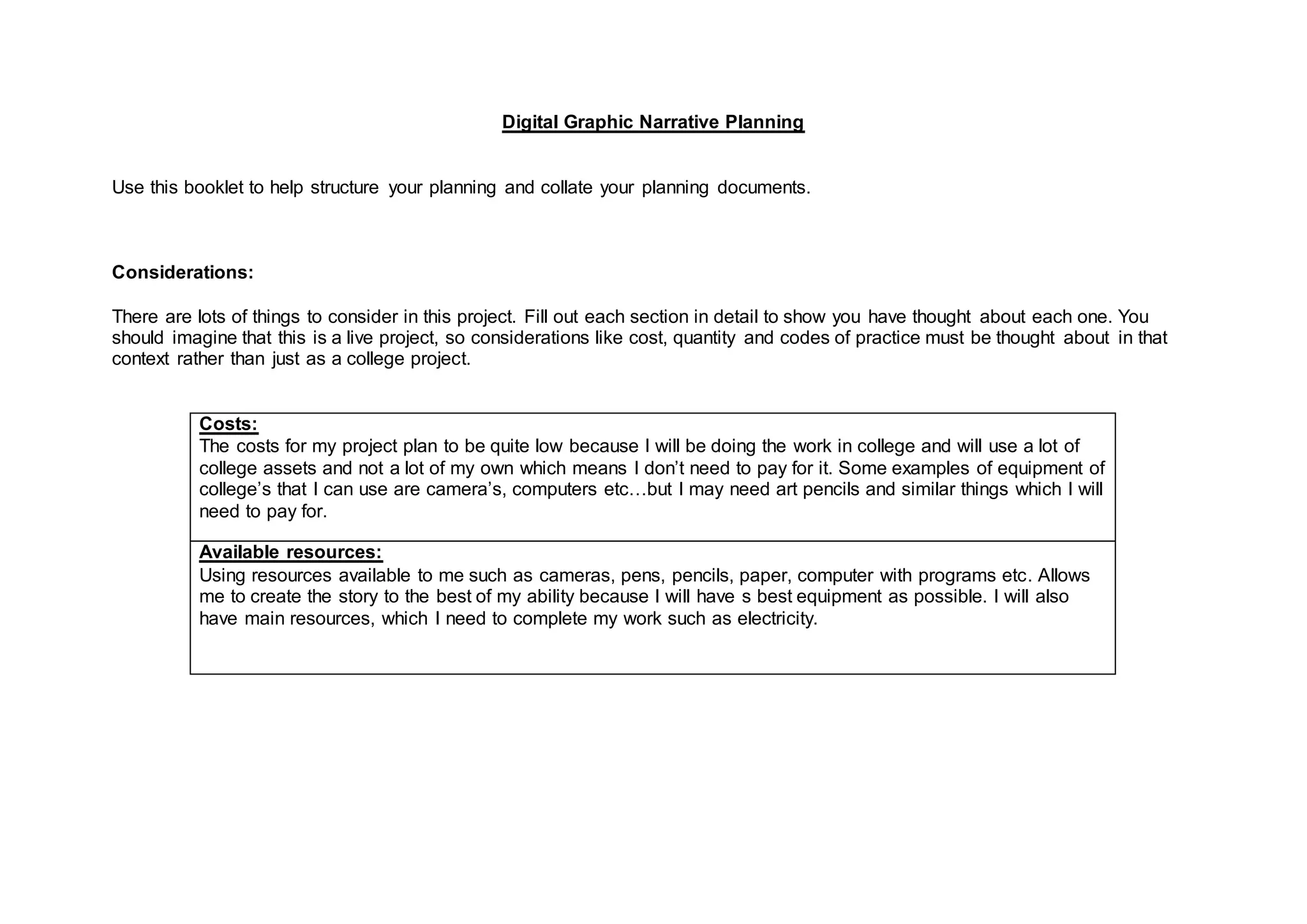 The document outlines the planning process for a digital graphic narrative project. It includes sections on considerations, costs, available resources, quantity, audience, quality factors, codes of practice, regulation, copyright, ethical issues, and health and safety. The planning process involves assessing available resources, creating a production schedule to complete the project on time, and identifying potential health and safety risks and how to prevent them.