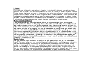 This document provides planning details for a digital graphic narrative project. It considers various costs, available resources, quantity, audience, quality factors, codes of practice, regulations, copyright, ethical issues, and health and safety considerations. A production schedule is also included to help manage the project timeline.