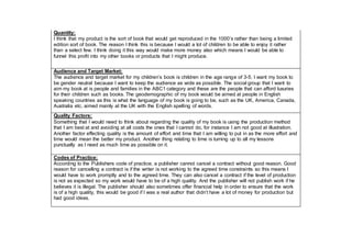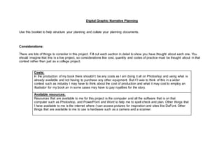 The document provides planning details for a digital graphic narrative project. It includes considerations for costs, available resources, quantity, audience/market, quality factors, codes of practice, regulations, copyright, ethical issues, and a production schedule. Health and safety risks like eyestrain, back problems, and tripping hazards are identified along with preventative measures grounded in relevant legislation.