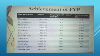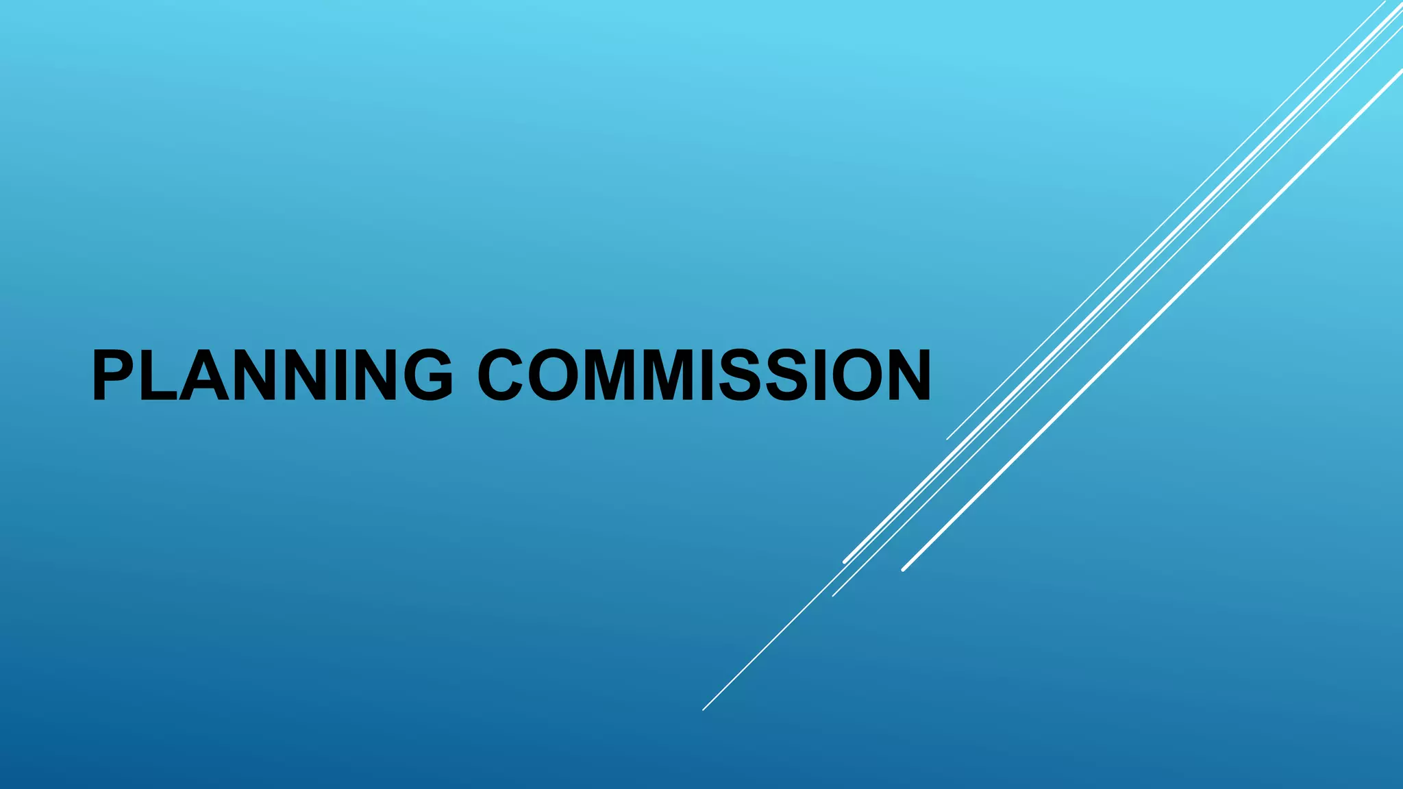 The Planning Commission was established in 1950 by the Government of India to foster economic development and social justice. It formulated five-year plans to promote balanced utilization of resources and monitor development programs and funds. Key objectives of early plans included increasing food production, reducing poverty and achieving self-sufficiency. Plans focused on agriculture, irrigation, industry and social development. The Planning Commission was replaced by the NITI Aayog in 2014.