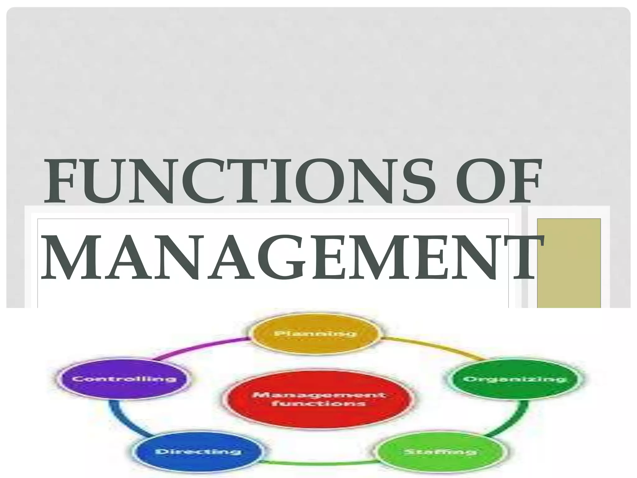 This document discusses the functions of management. It defines management as a process of related activities aimed at achieving organizational goals. The main functions of management include planning, organizing, staffing, directing, coordinating, and controlling. Planning is described as the first and most important management function. Planning involves deciding in advance what to do, how to do it, when to do it, and who will do it. Planning helps set clear objectives, provides a path of action, improves performance, minimizes risks, leads to optimal resource utilization, facilitates decision making and coordination of activities, and promotes innovative ideas.