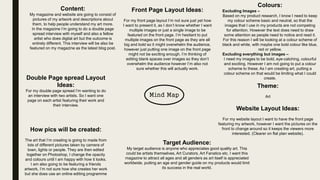 The document provides details on Sumiah Rose's plans for an art magazine and website. It discusses choosing a basic color scheme of black, white, and one bold color for text. Images will be colorful and unrestricted. The target audience is anyone who appreciates art. Content will include pictures and descriptions of Sumiah's artwork and a double-page interview spread with Sumiah and a fellow digital artist. Art will be created by editing together photos in Photoshop. Layout ideas are discussed for the front cover, double-page spread, and website. A style sheet and interview questions are also included.