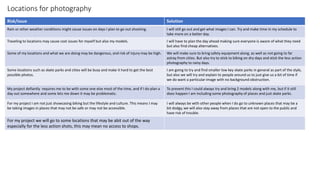 The document discusses planning for an FMP photography project focused on BMX culture. It addresses potential risks and issues at photo shoot locations and proposes solutions, such as bringing safety gear, sticking to less dangerous activities on rainy days, and explaining to others at busy locations to give some time and space. It also discusses financing costs of transport, food, equipment and hiring models. Potential article ideas, magazine content including ads and interviews, font and color scheme options are proposed. Layout plans for the cover and double page spreads are included.
