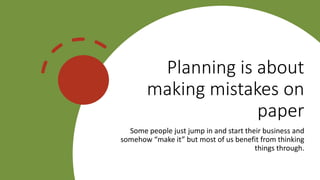 Planning is essential for business viability and reducing risks of failure. A strategic plan should be developed using common business planning tools to analyze the environment, such as PEST, SWOT, and SOAR analyses. The strategic plan establishes the business direction by documenting its mission, vision, values, long-term goals, and action plans to achieve goals, helping ensure the business idea is viable before launching.