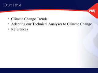 The document discusses how climate change trends should be incorporated into floodplain mapping and flood control project planning. It summarizes reports on topics like increased precipitation and sea level rise. It recommends considering a range of climate change scenarios in technical analyses, like higher sea levels and more intense storms. Adaptation strategies may include revised flood maps, upgraded infrastructure, and modified planning guidelines.