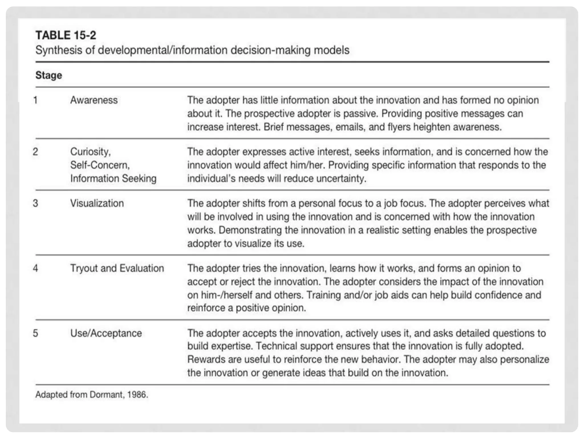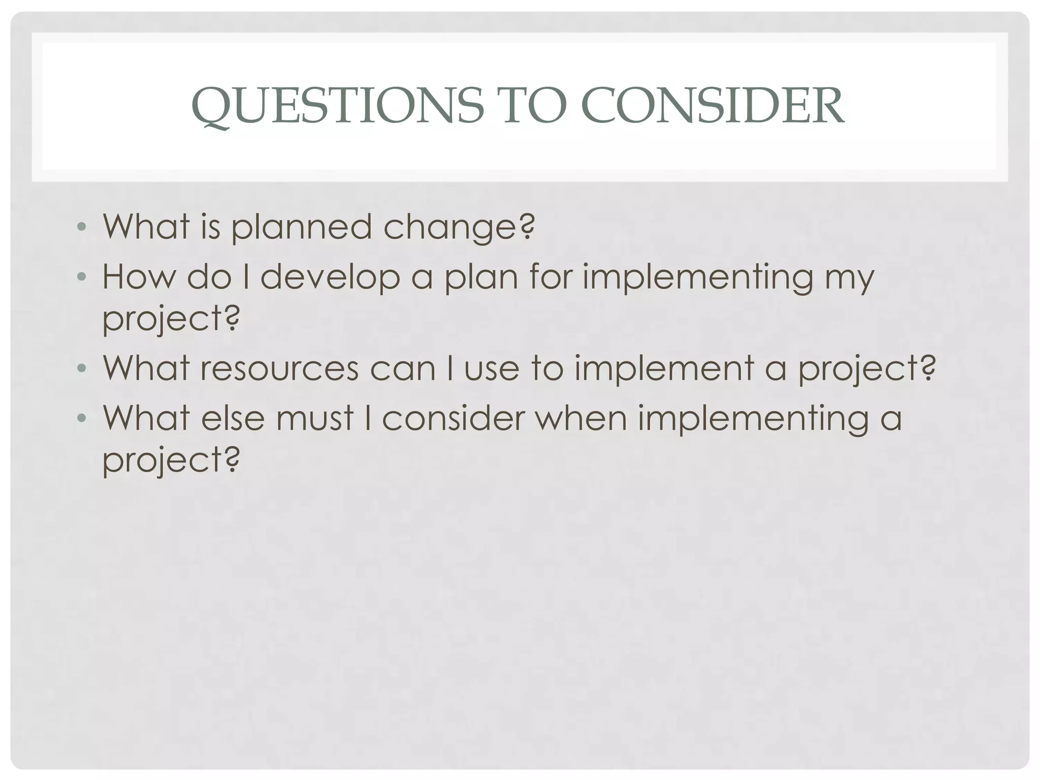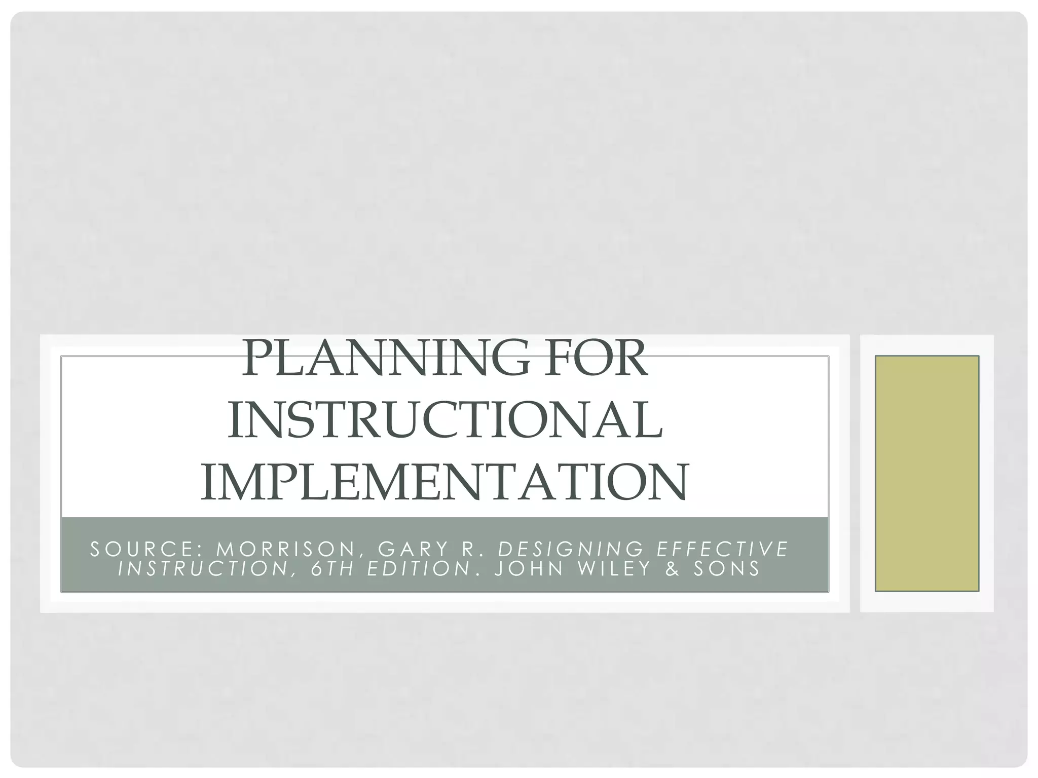 This document discusses key factors to consider when planning for the implementation of an instructional project. It describes planned change and the diffusion process of communicating an innovation to potential users. When developing an implementation plan, it is important to analyze the innovation's advantages and compatibility, complexity level, ability to be tested, and observability of results. The plan should also account for communication channels, the timeline of adoption, and social relationships. The CLER model provides a framework to evaluate configurations, linkages, environment, and resources in order to facilitate adoption of the innovation.