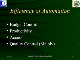 Cendrella Habre presented on planning for library automation at the Lebanese American University. She outlined a multi-phase process including pre-planning, data collection, system selection, and retrospective conversion. Habre emphasized assigning a project manager, communicating with stakeholders, keeping a reasonable schedule, and training staff strategically. For migrating between systems, she recommended extracting data carefully, establishing workflows in a test database, and assessing the new system. Flexibility and teamwork are keys to successful implementation.