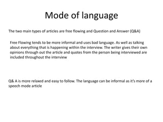 The document discusses two main types of articles: free flowing and question and answer (Q&A). Free flowing articles use informal language and include the writer's opinions throughout. Q&A articles have a simpler structure with questions followed by answers, making the information easier for the audience to follow without including the writer's views. The document expresses a preference for Q&A articles as they are more entertaining, personal, and focused on the interview subject rather than the writer.