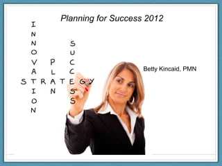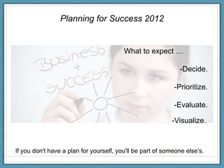 This document outlines a plan for success in 2012. It discusses deciding on priorities and goals, evaluating skills and passions. The main goal is to double website traffic and Twitter followers by end of 2012 to increase marketing, sales, cash flow and allow hiring an assistant. Three actions are described to achieve this: 1) Add class attendees to mailing list and send weekly compelling updates. 2) Design engaging social media pages and solicit email addresses. 3) Write compelling articles to generate comments and share on multiple sites, tracking results. The document emphasizes creating your own future through planning and using available resources.