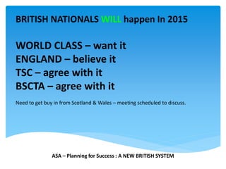 The document proposes a new British swimming competition structure to address issues like swimmers competing at high-level meets too early and an overemphasis on speed over technique. Key aspects of the proposal include restricting National Championships to ages 14+ by invitation only, moving County Championships to January-February, introducing short course seasons and championships, and empowering coaches to make decisions for individual athletes. The goal is to produce highly skilled swimmers by focusing on developing technique through age-appropriate competition. Buy-in is needed from Scotland and Wales on the changes.