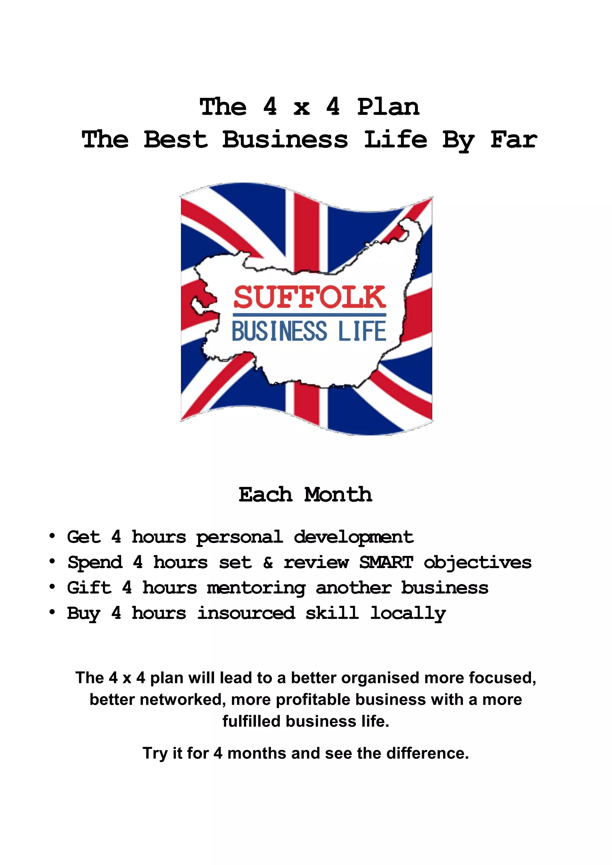 The document outlines a '4 x 4 plan' for growing businesses, emphasizing personal development, objective setting, mentoring, and local skill acquisition. It discusses common excuses for not having a written business plan and lists top reasons for business failure, including poor accounting and lack of cash cushion. The essentials for creating a business plan, including market research, operations, and financials, are highlighted to support goal setting and operational efficiency.