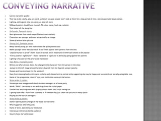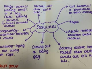 This document discusses planning for a trailer for a soap opera called "Freshers" with three storylines: 1) A drug storyline where Monica's boyfriend Grimmers pressures her into taking drugs. 2) A storyline where JP struggles to come out as gay to his friend Sophie. 3) A storyline where sisters Hal and Shad have a conflict that results in Hal running away from home. It provides details on the shots planned for each storyline and costumes assigned to characters, such as dark clothes for Grimmers to convey danger and scruffy clothes for Hal to indicate she is homeless. Character descriptions and props are also outlined.