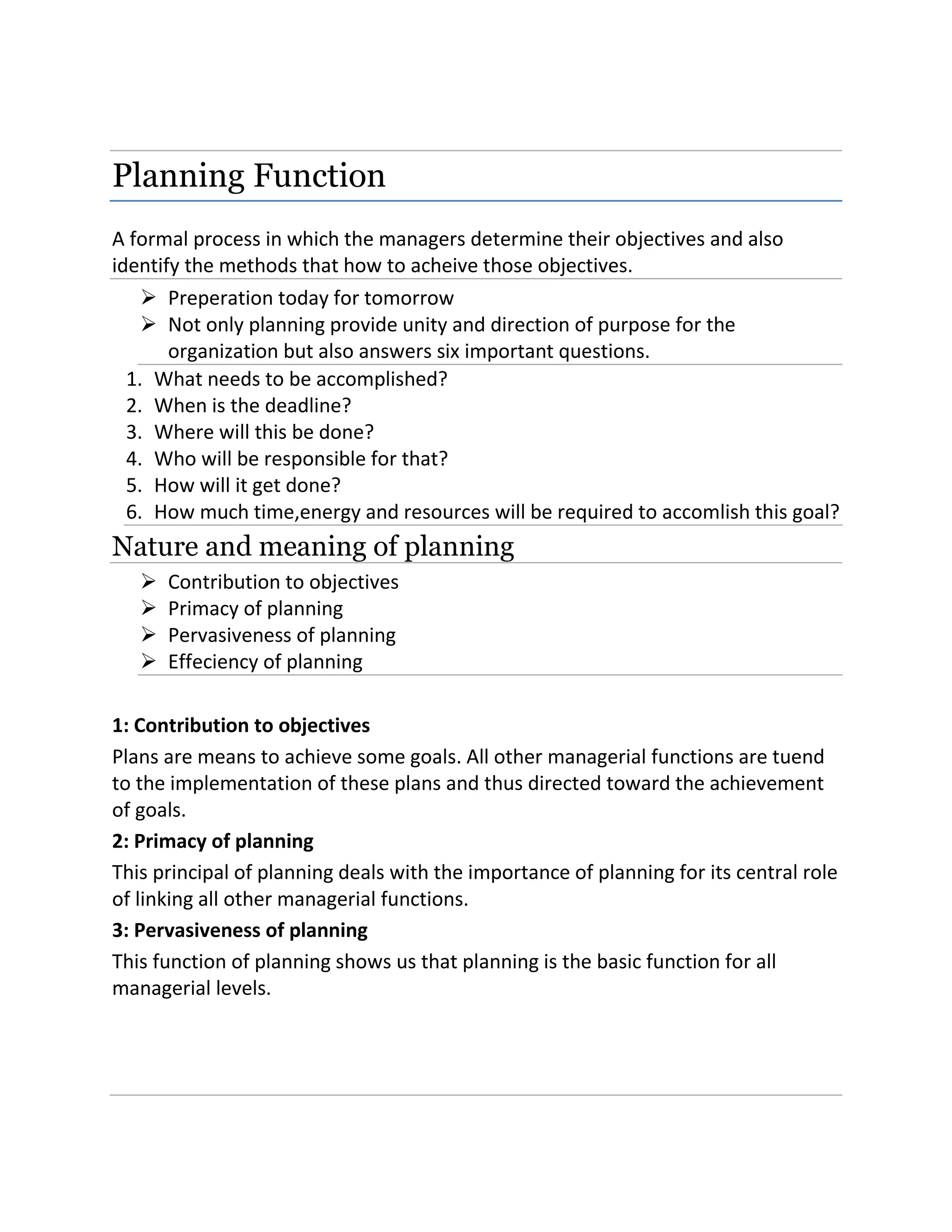 Planning is a formal process where managers determine objectives and identify methods to achieve them. There are different types of plans including strategic, tactical, and operational plans. Strategic plans outline steps to achieve overall organizational goals over 2-3 years. Tactical plans determine how to allocate resources to achieve strategic goals. Operational plans are used by managers to accomplish responsibilities and support tactical and strategic plans through activities like ongoing policies, procedures, and rules. Planning contributes to objectives, is central to linking managerial functions, and occurs at all management levels to efficiently measure progress towards goals.